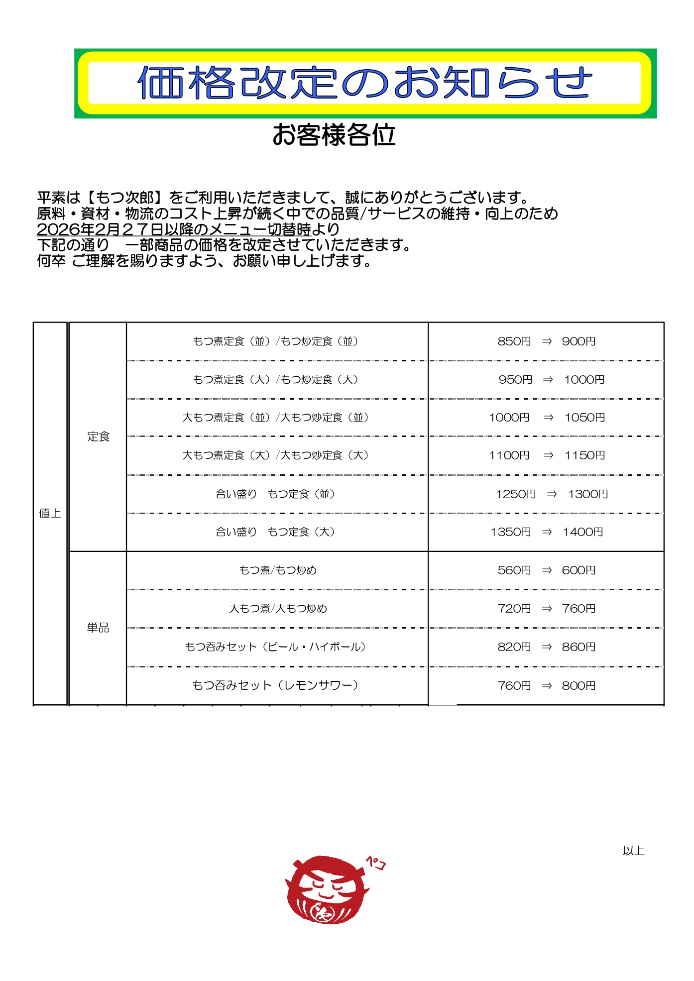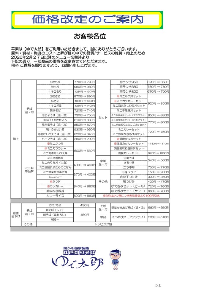 平素は【ゆで太郎】をご利用いただきまして、誠にありがとうございます。 原料・資材・物流のコスト上昇が続く中での品質/サービスの維持・向上のため 2026年2月27日以降のメニュー切替時より 下記の通り 一部商品の価格を改定させていただきます。 何卒 ご理解を賜りますよう、お願い申し上げます。